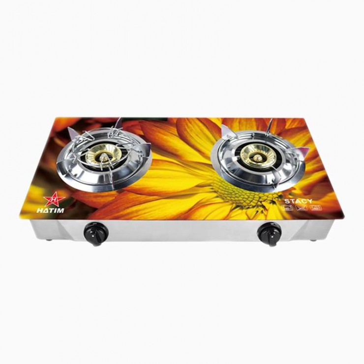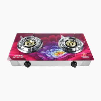 Body: colored tempered glass panel. Burner Cap: 100mm +100mm Gas Type: LPG/NG Gas Pressure: 2000Pa/3300Pa Heat Flow Rate(KW/H): 3.5, 3.5 Remarks: Smoke Free Blue Flame
